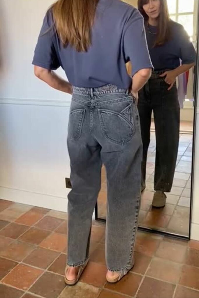 Sandy, die Gründerin von Happy Haus, überdimensioniert die Hose mit der Größe 37. Sie ist 170 cm groß.