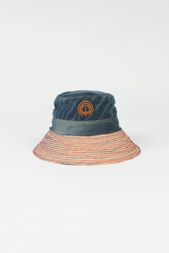Der Hut hat ein breites Rahivisier mit blauen Fäden und die Kappe wird aus unserem recycelten Denim in der Wäsche “5 YEARS dirty” hergestellt, der mit einem Tabakfaden bestickt ist, was einen schönen Kontrast schafft. Unser charakteristischer Pfau ist in einem weißen Garn gestickt, es ist sehr einfach zu kombinieren.