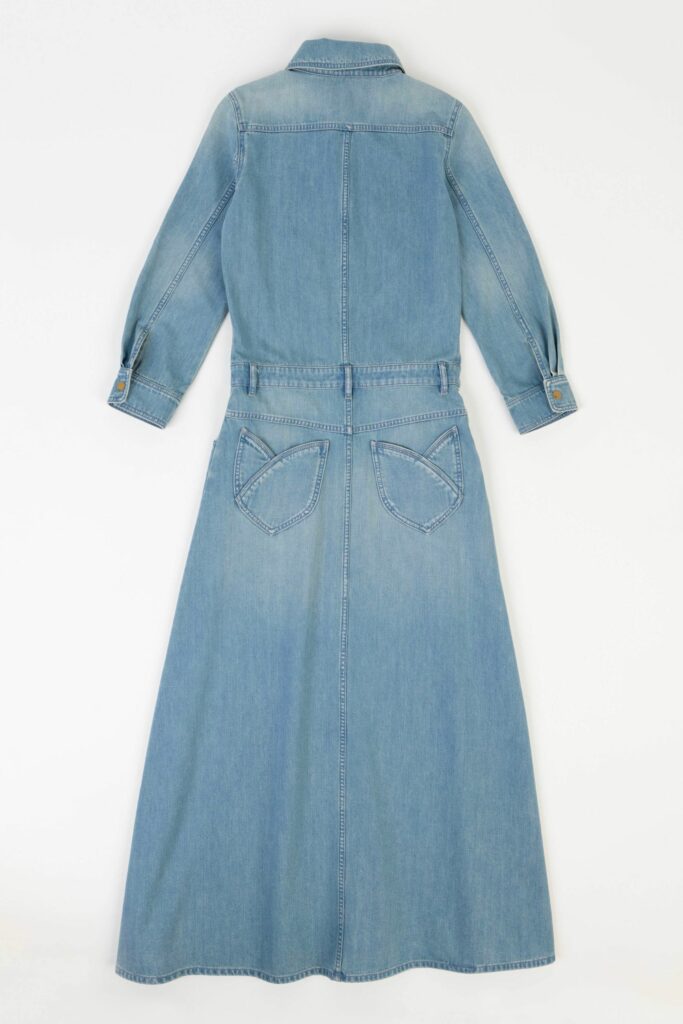 RECYCELTE BAUMWOLLE325 €Dieser Jeansrock ist aus einem dicken Stoff aus recycelter Baumwolle gefertigt. Er ist sehr lang und fällt bis zu den Knöcheln, mit einem hübschen Taschendetail in Form einer Blume auf der Rückseite. Es ist ein Stück mit Charakter, das in seiner Umgebung immer Eindruck macht, wenn man es trägt.