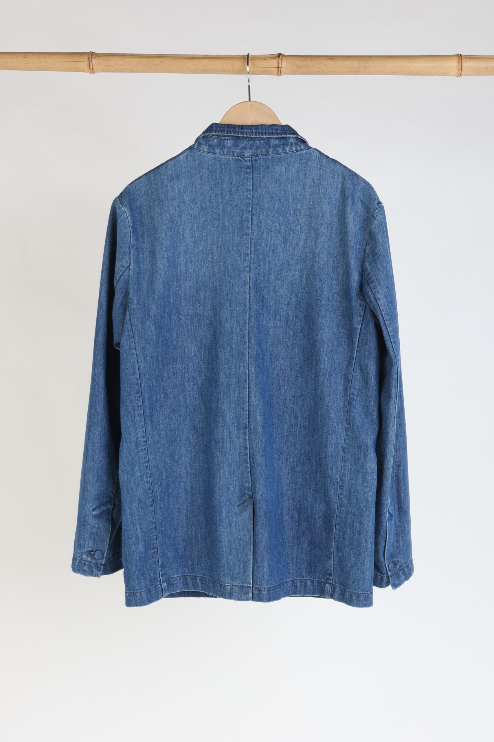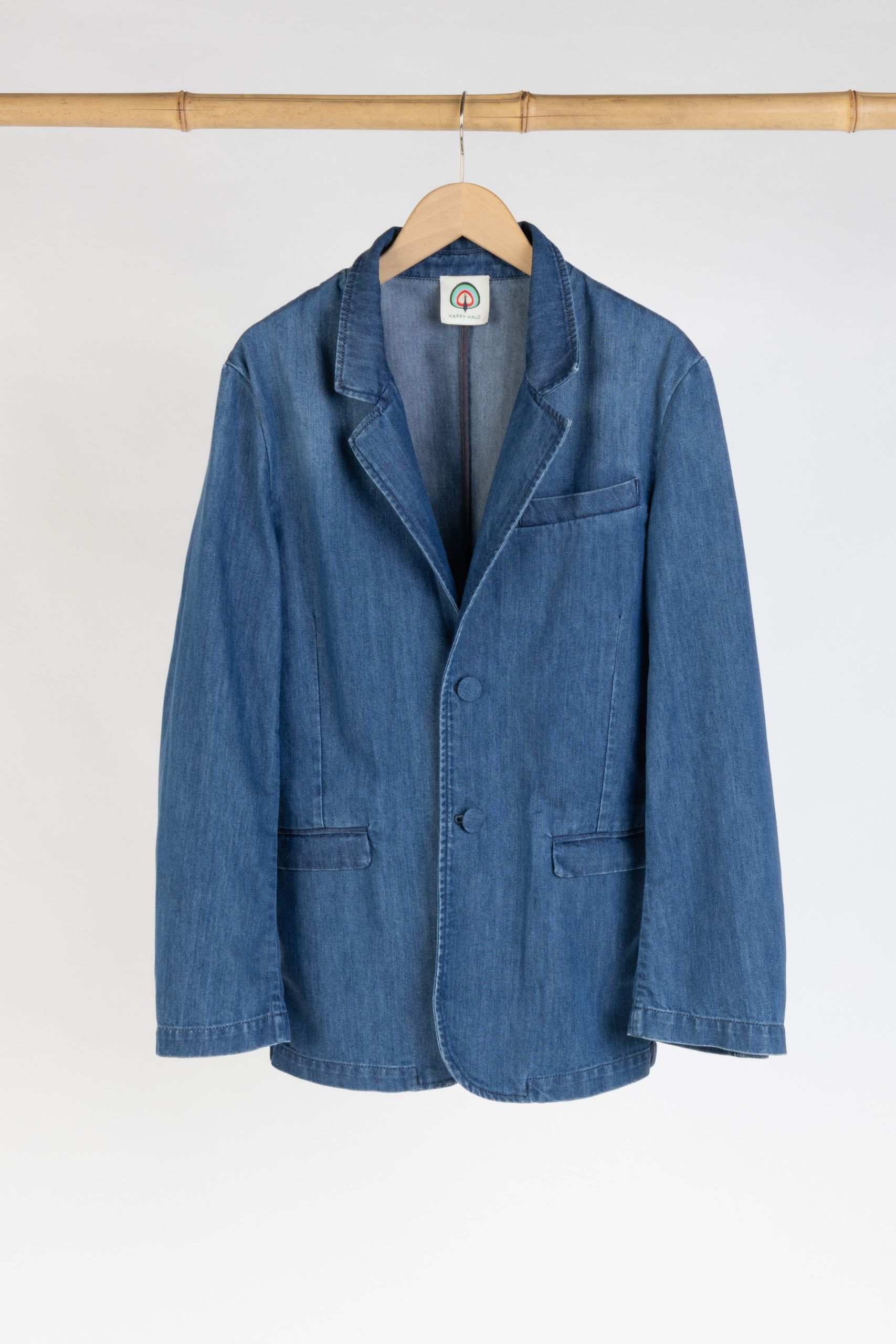 Hergestellt aus unserem leichten Denim. Es passt perfekt zu vielen Hosen, Röcken oder Kleidern. Es ist ein interessantes Stück, um auch Overlays zu spielen, zum Beispiel unter einem Mantel im Winter.