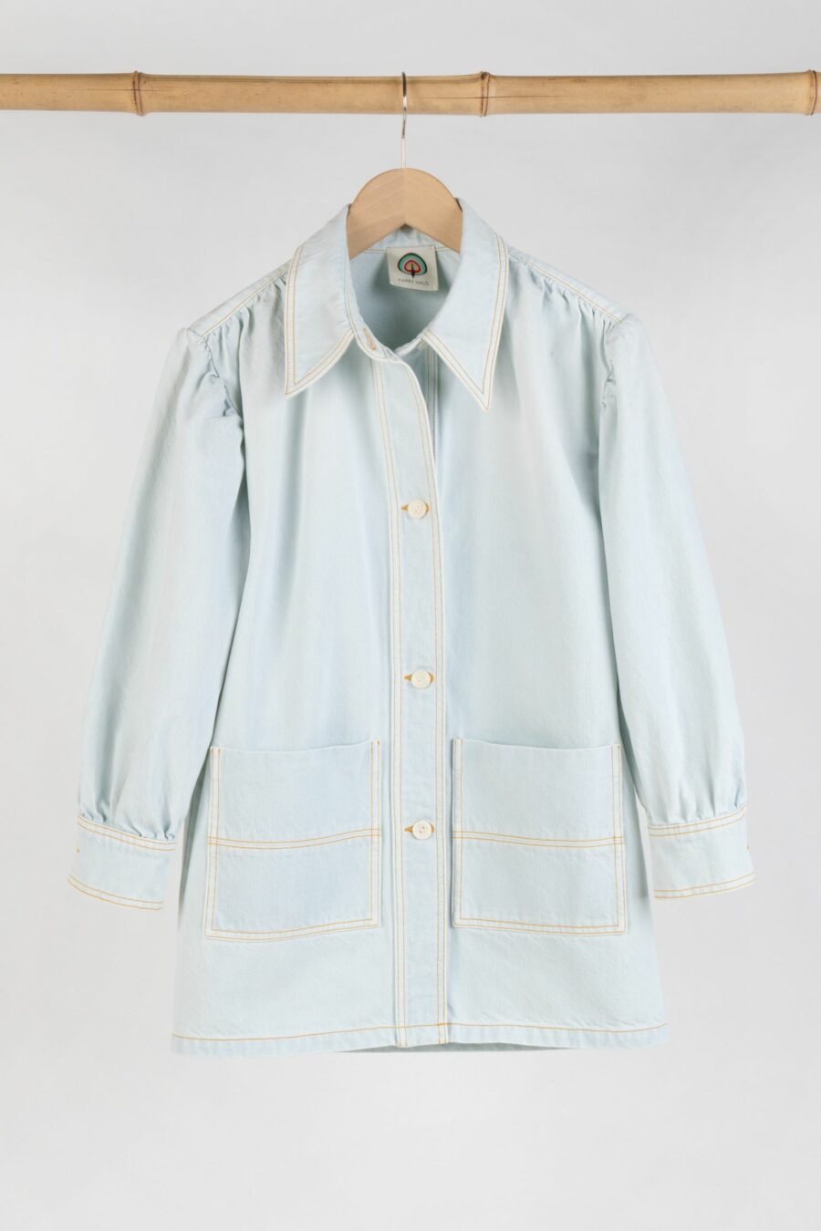 It is distinguished by pretty details: two large patch pockets at the front, a wooden button closure and tobacco topstitching that highlight the lines of the piece and give it character. On the back, a HAPPY HAUS embroidery discreetly signs the model.