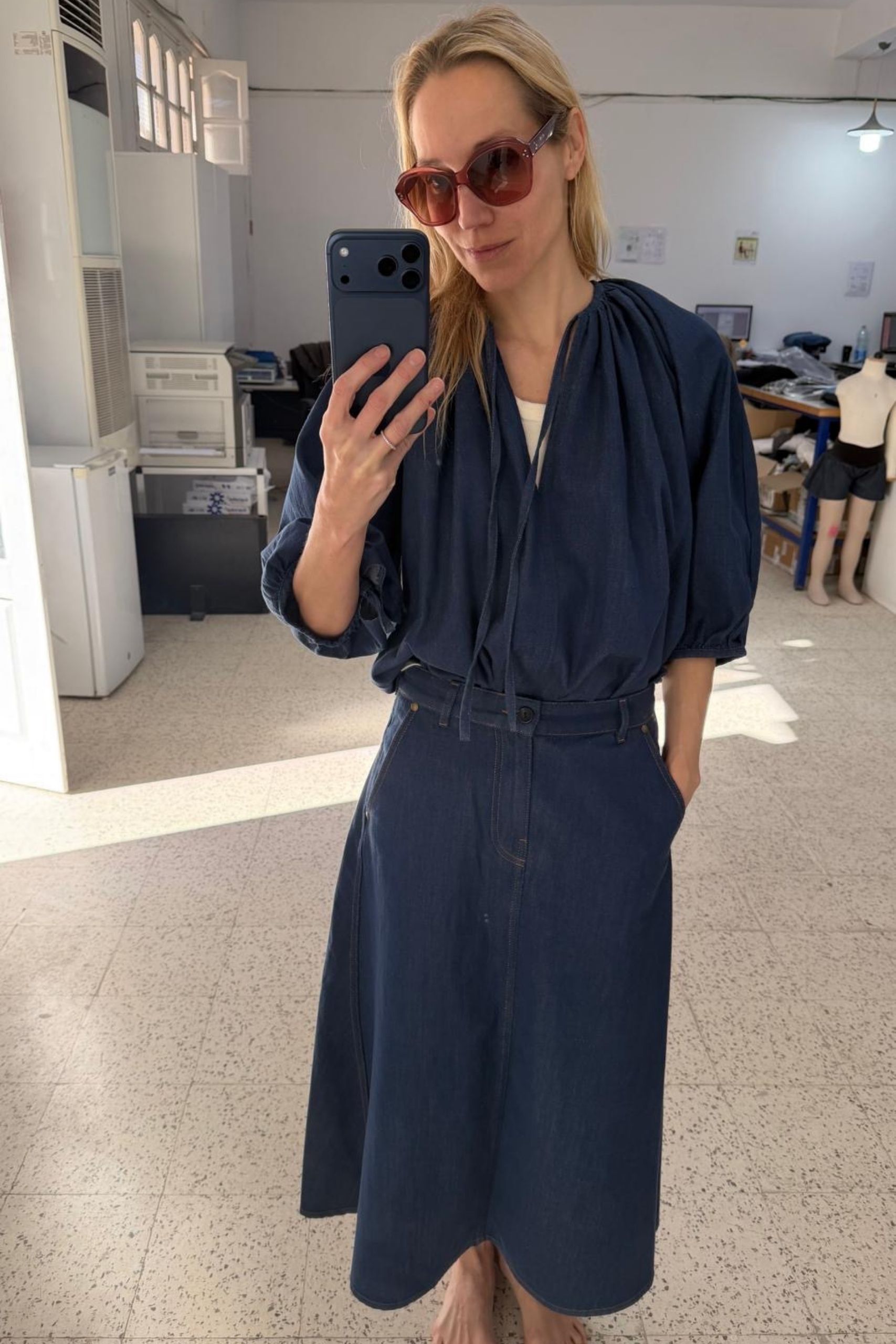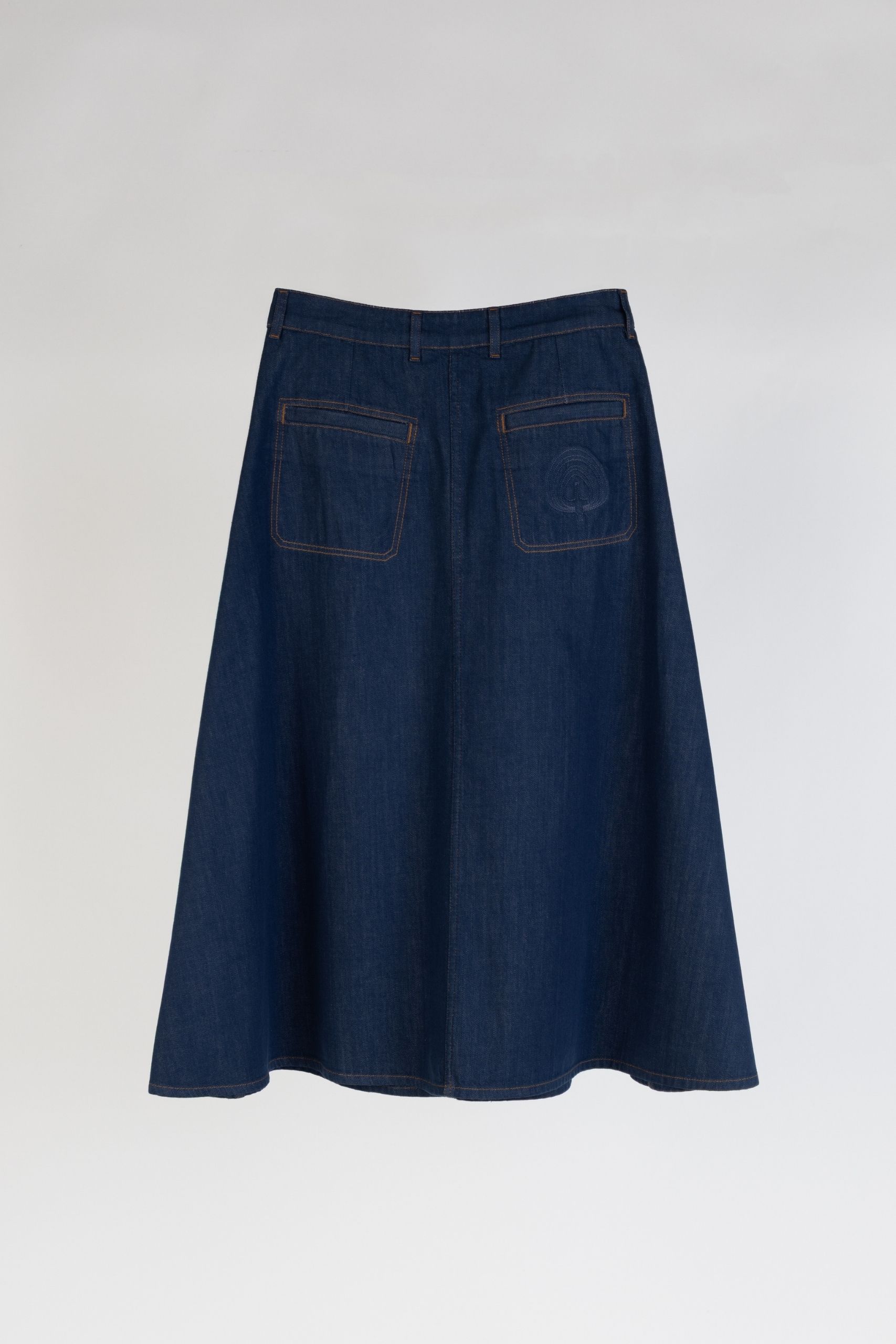 À la fois souple et structurée, elle offre un mouvement naturel et un confort remarquable. Sa coupe midi évasée dessine une silhouette féminine et fluide, facile à porter au quotidien. Les surpiqûres contrastées soulignent le travail du denim, tandis que la taille haute structure la silhouette avec élégance.