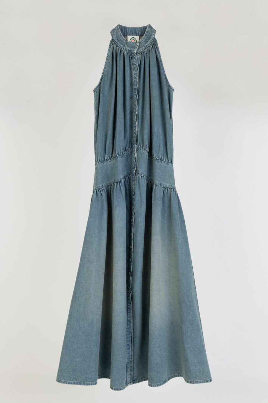 Confectionnée dans un denim léger au lavage light blue vintage, elle associe coton et viscose pour un toucher doux et une sensation de douceur et de fluidité.