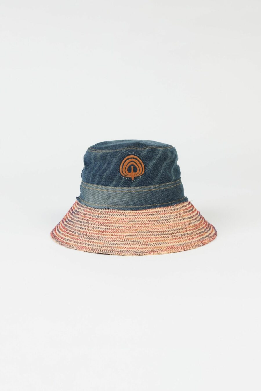 Le chapeau possède une large visière en raphia surpiqué de fils multicolores et la calotte est réalisé dans notre denim recyclé dans le lavage “5 YEARS dirty” surpiqué d’un fil tabac, ce qui lui créé un joli contraste. Notre paon signature est brodé dans un fil de couleur tabac.